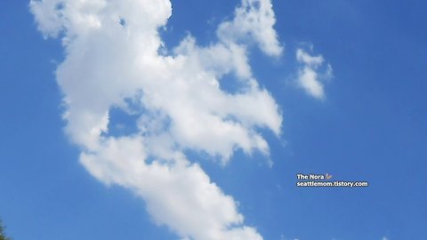 첫째랑 잠시 나갔다가 나간 김이 조금 걸었어요. 날이 너무 덥고 햇빛이 강해서 많이 걷지는 못했고 햇빛 조금 쬐다가 집으로 돌아왔어요. 집 안으로 들어가기 전 하늘을 바라본 순간 멋진 구름이 떠 있는 것을 발견했습니다. 구름이 신기하게도 북미 대륙 (북 아메리카, North America)과 비슷한 거예요! 저 위 그린란드까지 확인할 수 있을 정도였으니까요. 이 멋진 구름을 그냥 지나칠 수 없어 집으로 마구 달려가 핸드폰을 가지고 나왔죠. 아마 1-2분 걸렸을까... 그런데 그동안 하늘 구름계에 큰 지각변동이 있었더군요. 정말 열심히 뛰었는데 그 짧은 사이 하늘의 구름 대륙계에서는 대륙이동이 한창 진행되었습니다. 흑흑. 그린란드, 캐나다, 미국 지역은 많이 뭉그러졌어요. 멕시코 지역과 중남미 지역은 그래..