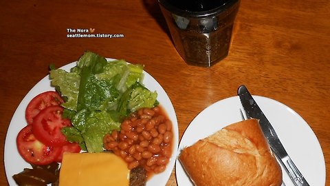 오늘은 금요일 저녁. 간단하게 햄버거를 만들어 먹습니다. 식구들은 햄버거 번에 패티를 끼워 모두 클래식한 햄버거로 먹는데 저는 또 다르게 먹고 싶어졌어요. 그래서 햄버거 패티와 있는 다른 재료들을 모아 햄버거 스테이크(함박 스테이크)로 만들어서 먹었습니다. 이 선택이 참으로 탁월했어요. 아주 맛있었습니다. 따뜻한 패티 위에 치즈 한장 덮고, 할러피뇨 피클, 토마토, 로메인 상추, pork and beans를 사이드로 함께 놓았어요. 약간의 탄수화물도 함께 하는 것이 좋을 것 같아서 프렌치 바게트 잘라서 가져왔습니다. 이렇게 두니까 멋진 식사가 되었어요. 이렇게 음식을 차려 먹으니까 남편이 콜라 한 잔 따라서 가져 옵니다. 그래서 둘이 나눠 마실 거예요. 노라는 신선한(?) 시도로 햄버거 스테이크 & 남편..